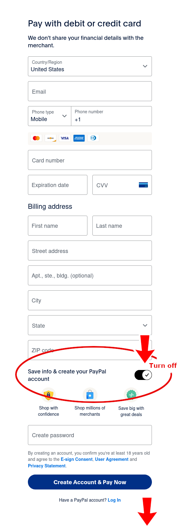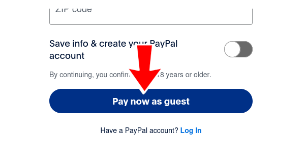 Enter the required information. If you do not want to create a PayPal account, turn off the 'Save info and create your PayPal account' option. Then, 'Pay now as guest' will be displayed.