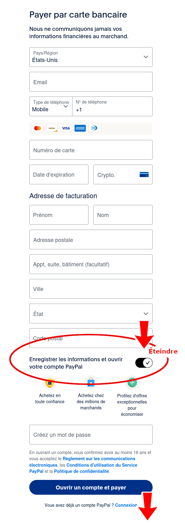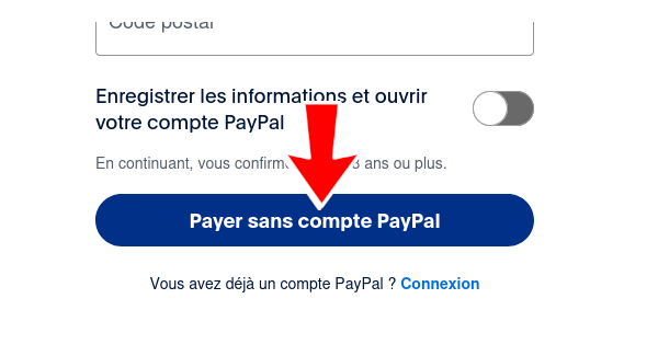 Saisissez les informations requises. Si vous ne souhaitez pas créer de compte PayPal, désactivez l'option « Enregistrer les informations et créer votre compte PayPal ». Ensuite, « Payer maintenant en tant qu'invité » s'affichera.