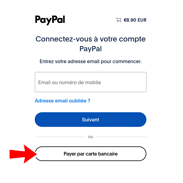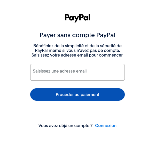 La page suivante vous demandera votre adresse e-mail. PayPal enverra votre reçu à cette adresse e-mail.